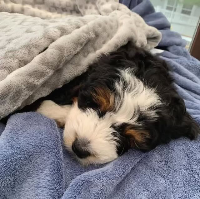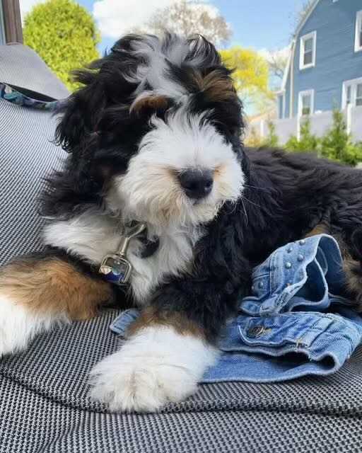This beautiful female Bernedoodle puppy is a stunning example of the breed, featuring a soft, fluffy tri-color coat of black, white, and rich brown accents. As a standard Bernedoodle, she is expected to grow into a medium-to-large companion with a friendly and affectionate personality.