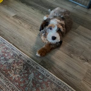 This stunning female Mini Bernedoodle puppy is truly one of a kind, featuring a beautiful tri-color coat paired with rare, captivating blue eyes that make her stand out instantly. Her soft, fluffy fur and perfectly marked face give her an irresistible, cuddly teddy-bear appearance.